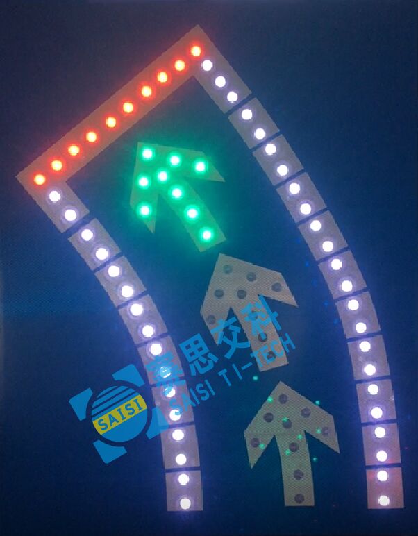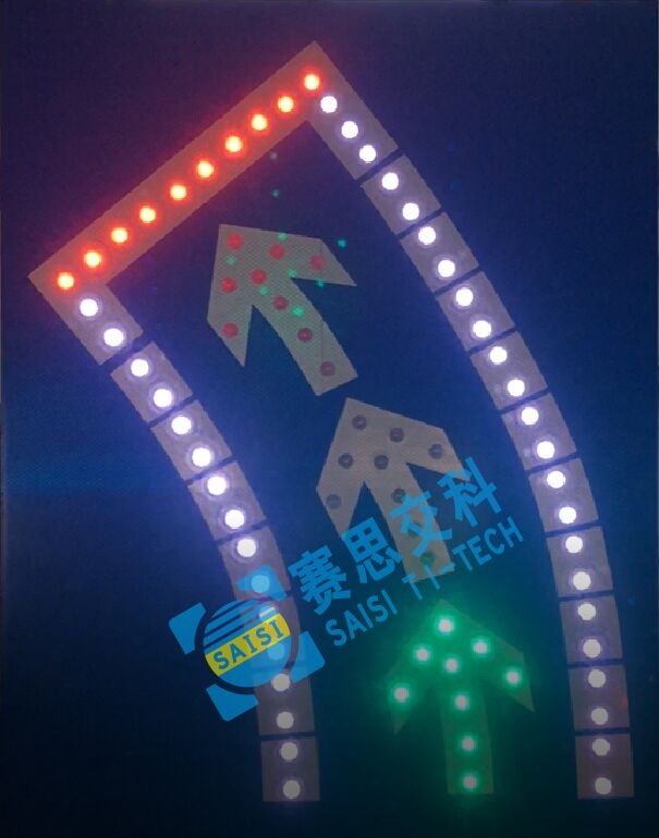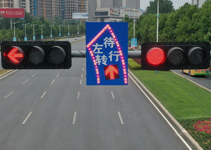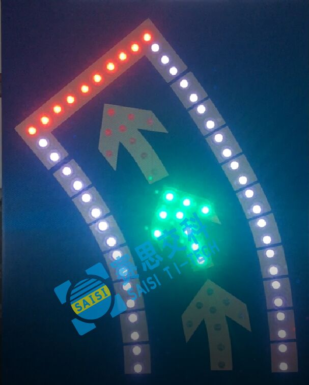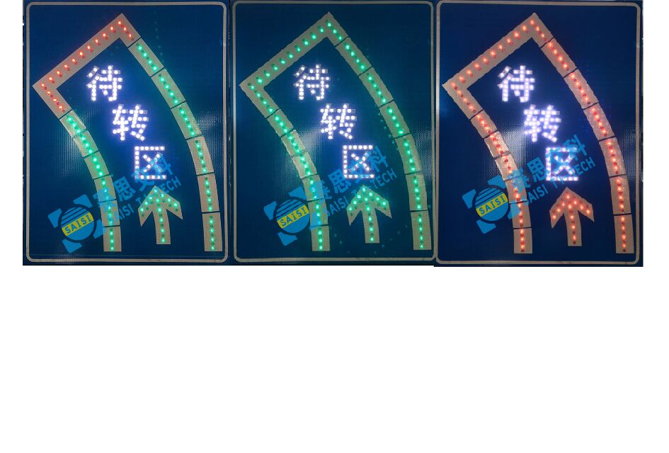 2、工藝說明:標志版面由LED發光管組成停車線、邊緣線、箭頭圖形,通過控制模塊調取信號燈燈色狀態,在標志版面形成動態三種狀態,動態引導待轉車流通行權限。