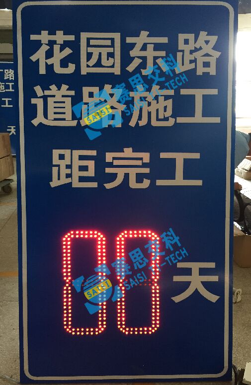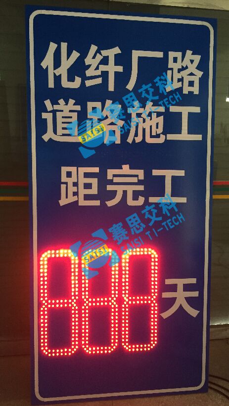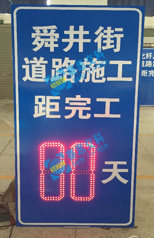 1、工藝說明:在標志版面中嵌入“8”字型LED發光條碼,可根據需要設置組數(個位、十位、百位),自動校正時間節點,動態發光顯示剩余天數,有效告知施工區作業時間。