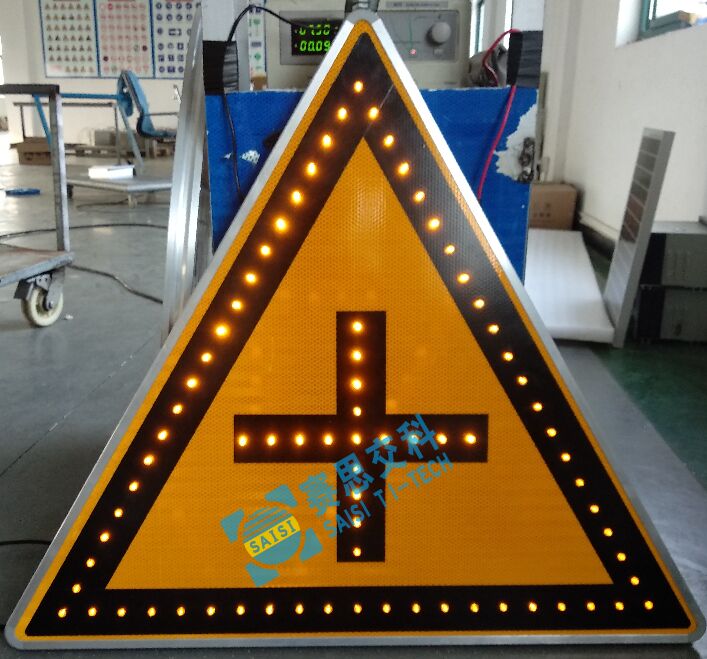 在未設置信號燈的畸形交叉口,常常由于優先通行路權沒有明確,車輛會車時,極易發生碰撞事故,可以通過設置“?!弊?、“讓”字、“慢”字等公路發光標志牌,和必要的路權分配指引標志(如:“太陽能右下行發光警示柱”等),明確各方向的優先路權,同時公路發光標志牌具備遠距離的視認性,讓不同方向的交通流能遠距離發現前方交叉口的路權分配信息。