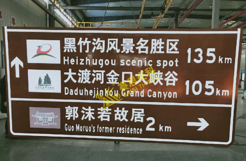 采用主動發光工藝的旅游標志牌,其版面通常由:風景點名稱文字、預告距離、引導方向箭頭、風景區圖片LOGO等組成,標志底板采用棕色反光膜(旅游標志專用膜)。標志主動發光工藝,采用內置光源定向投射標志面板,形成自主發光的效果。其優點主要有: