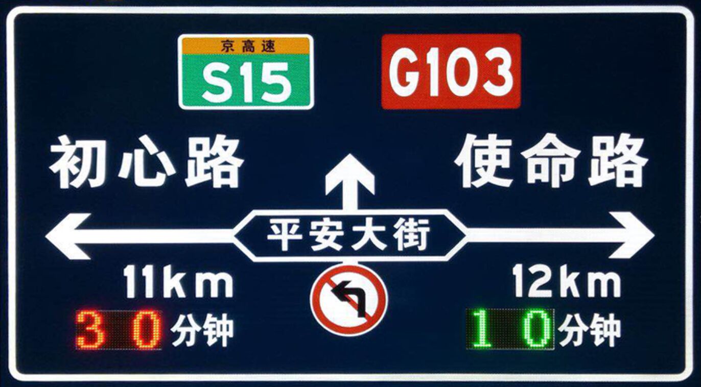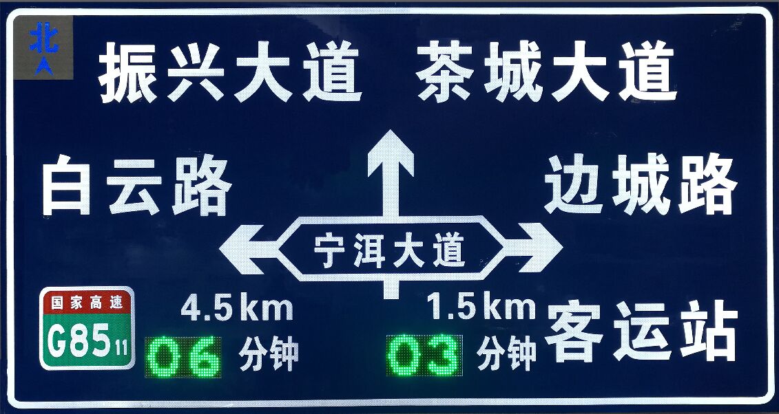 將標(biāo)志安裝點位與重要節(jié)點的距離長度、到達預(yù)估時間有效統(tǒng)一在標(biāo)志版面中,給機動交通參與者提供時間、空間的實時數(shù)據(jù)參考,及時改善行車預(yù)期軌跡,為交通管理部門緩解交通擁堵,合理分配區(qū)域交通流,提供有效的宏觀規(guī)劃。