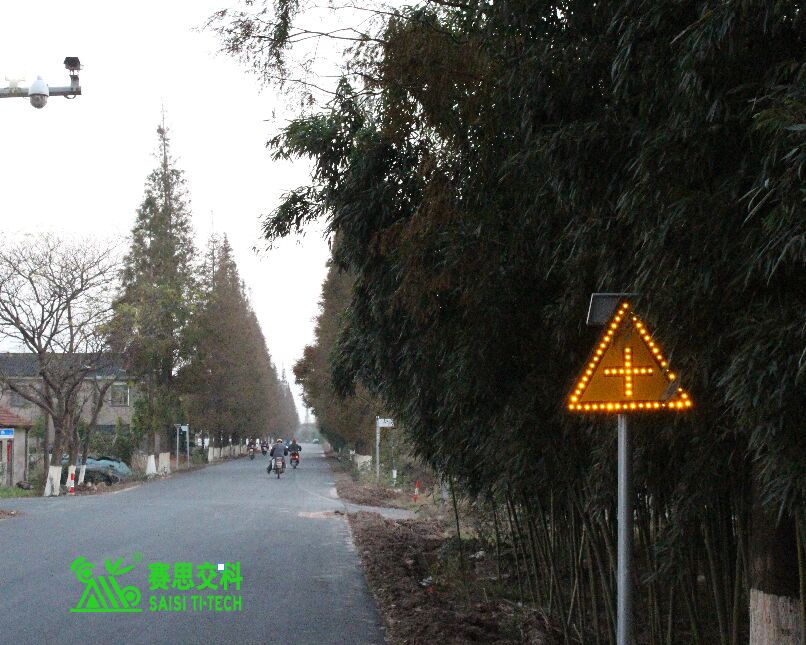 ②交通標(biāo)志。公路主線應(yīng)設(shè)置必要的“限速+注意前方岔口”標(biāo)志,有條件的,可采用太陽能主動發(fā)光標(biāo)志,以提升遠(yuǎn)距離視認(rèn)性,及夜間警示效果。
