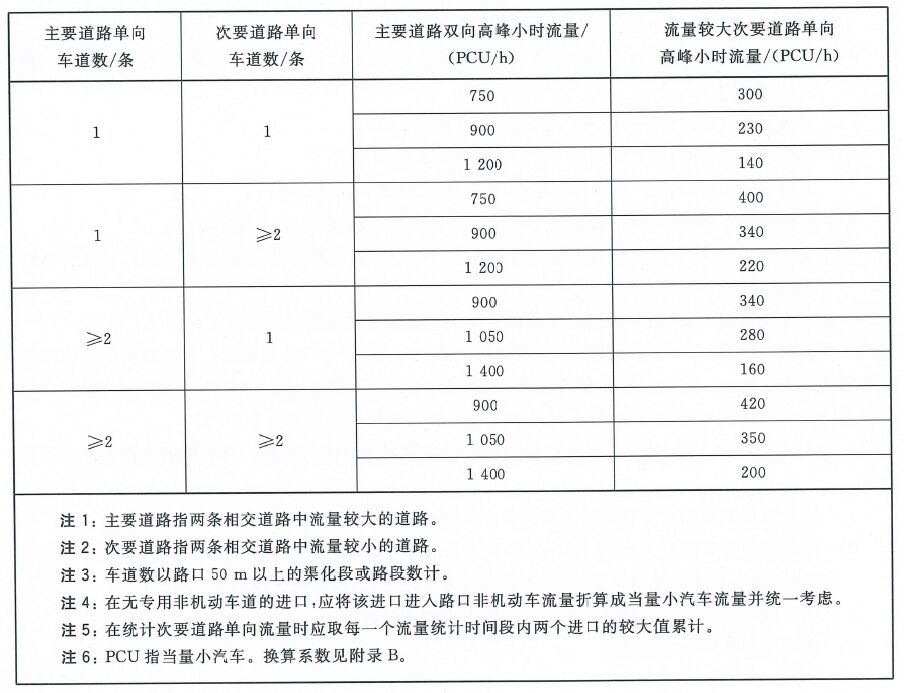 I、條件一:路口機(jī)動車高峰小時(shí)流量超過下表所列數(shù)值時(shí);