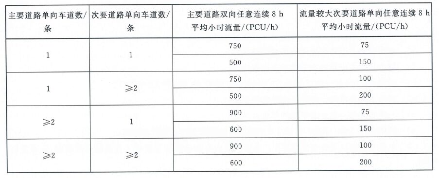 II、條件二:路口任意8小時(shí)的機(jī)動車平均小時(shí)流量超過下表數(shù)值時(shí)。