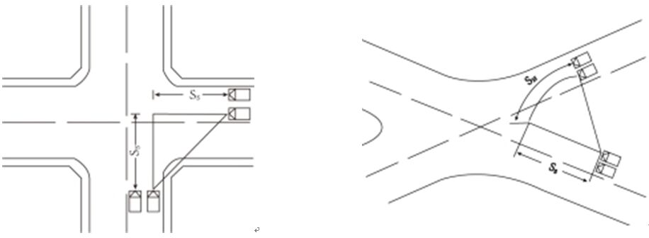 II、停車線垂直面對來車方向?;谓尤肟?,可通過交通標(biāo)線渠化設(shè)計(jì),將停車線垂直方向面向來車方向,增強(qiáng)支路流量進(jìn)入叉口的觀察視角。