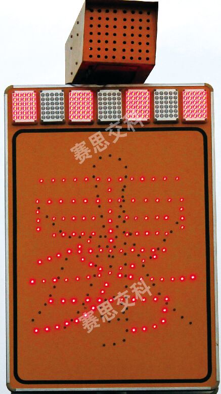 3、標志版面:標志整體為IV類黃色底模,不貼字膜,通過LED線型點陣勾勒出險情圖案或文字,標志上部設置各四只紅藍交替簡易型爆閃燈。